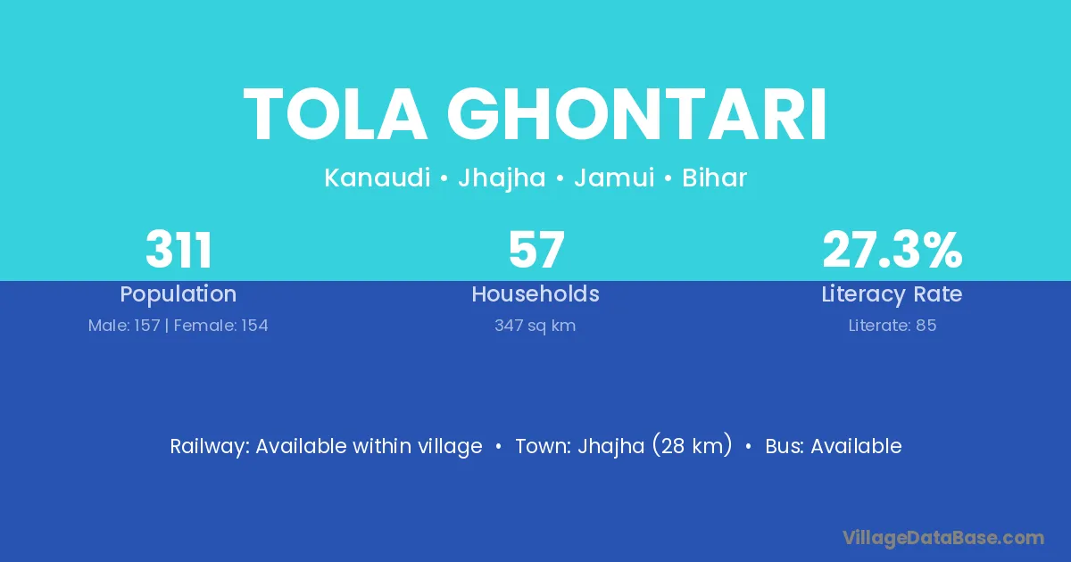 Jhajha (28 km) is the nearest town to Tola Ghontari village for major economic activities and is located approximately 28 km away.