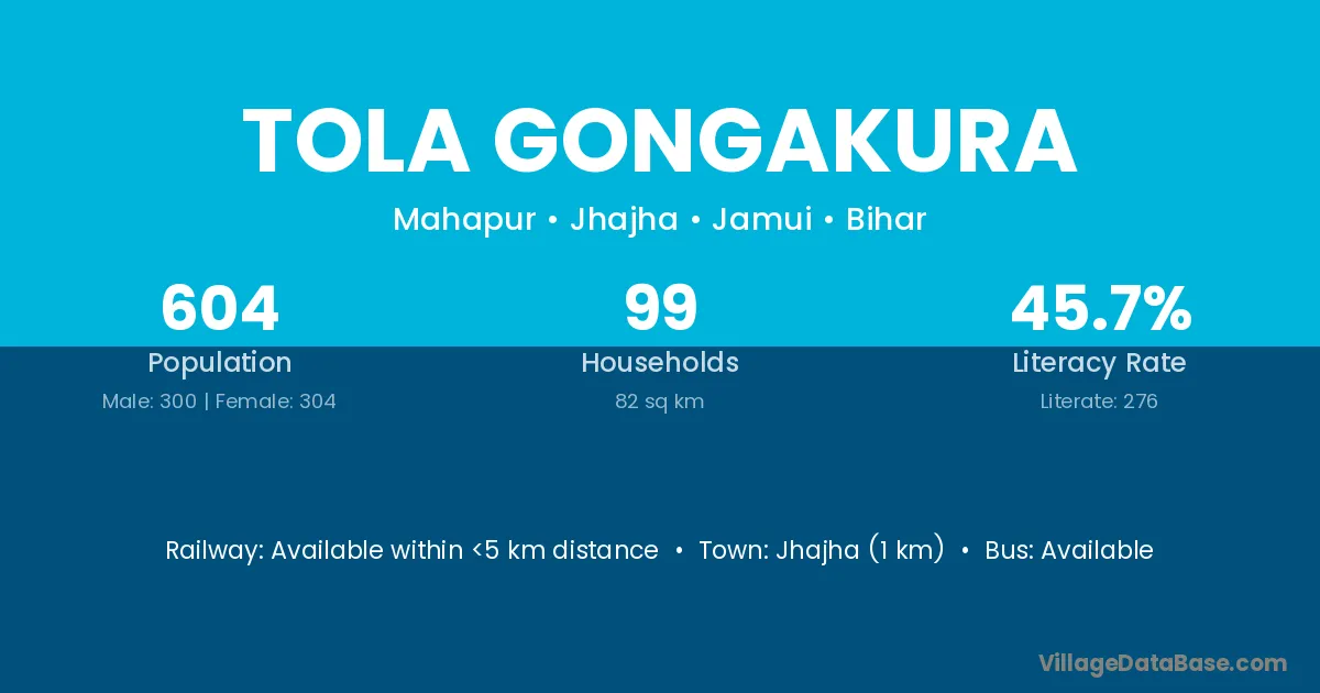 Jhajha (1 km) is the nearest town to Tola Gongakura village for major economic activities and is located approximately 1 km away.