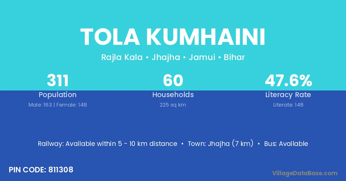 Jhajha (7 km) is the nearest town to Tola Kumhaini village for major economic activities and is located approximately 7 km away.