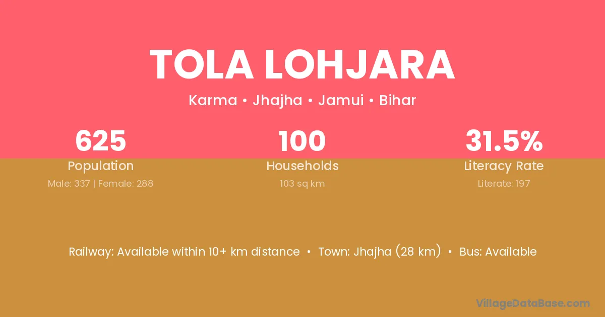 Jhajha (28 km) is the nearest town to Tola Lohjara village for major economic activities and is located approximately 28 km away.