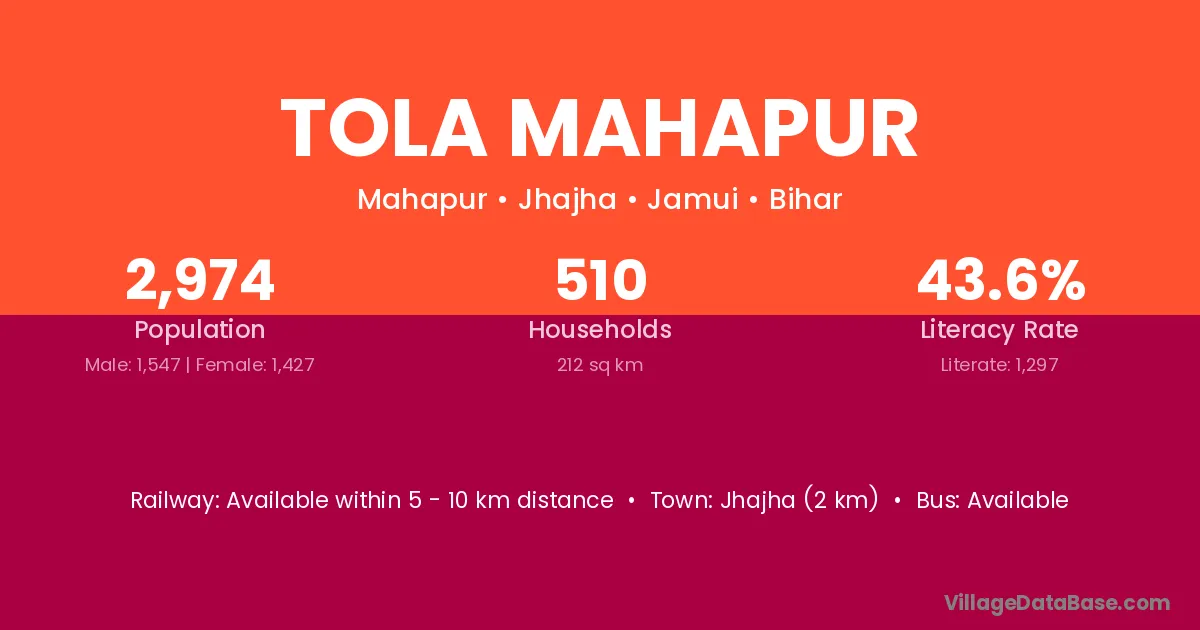 Jhajha (2 km) is the nearest town to Tola Mahapur village for major economic activities and is located approximately 2 km away.