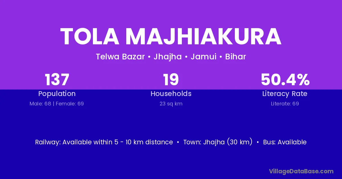 Jhajha (30 km) is the nearest town to Tola Majhiakura village for major economic activities and is located approximately 30 km away.