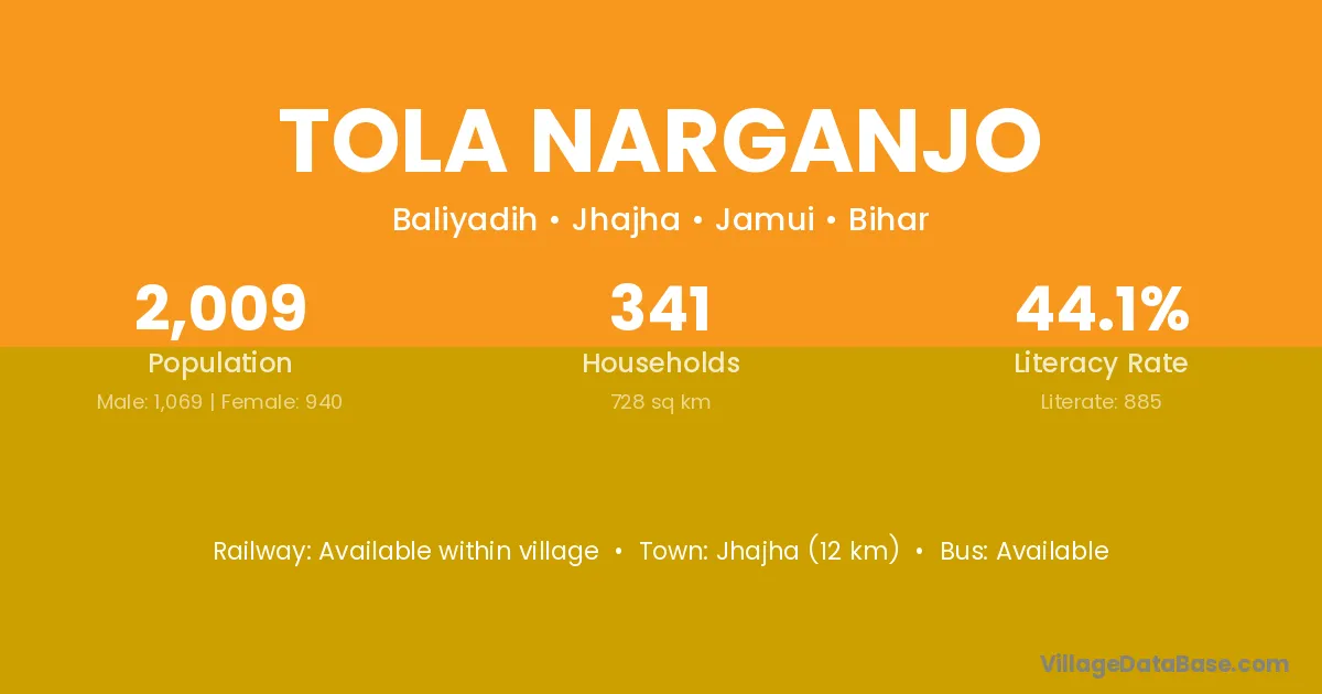 Jhajha (12 km) is the nearest town to Tola Narganjo village for major economic activities and is located approximately 12 km away.