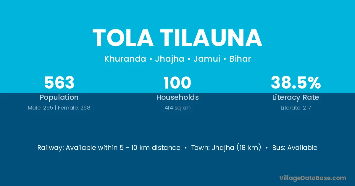 Jhajha (18 km) is the nearest town to Tola Tilauna village for major economic activities and is located approximately 18 km away.