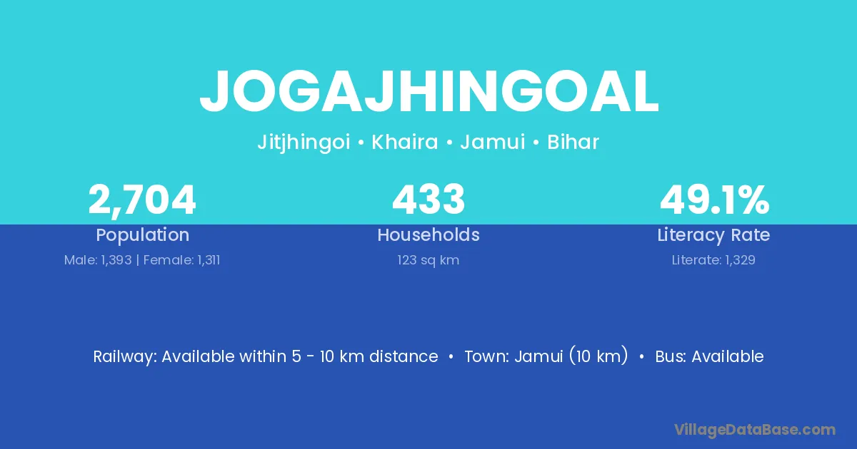 Jamui (10 km) is the nearest town to Jogajhingoal village for major economic activities and is located approximately 10 km away.