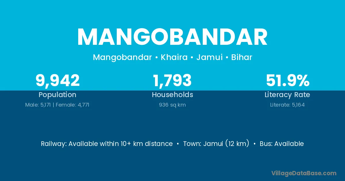 Jamui (12 km) is the nearest town to Mangobandar village for major economic activities and is located approximately 12 km away.