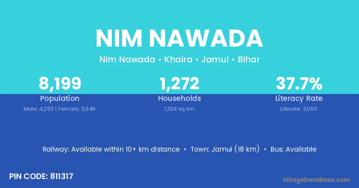 Jamui (18 km) is the nearest town to Nim Nawada village for major economic activities and is located approximately 18 km away.