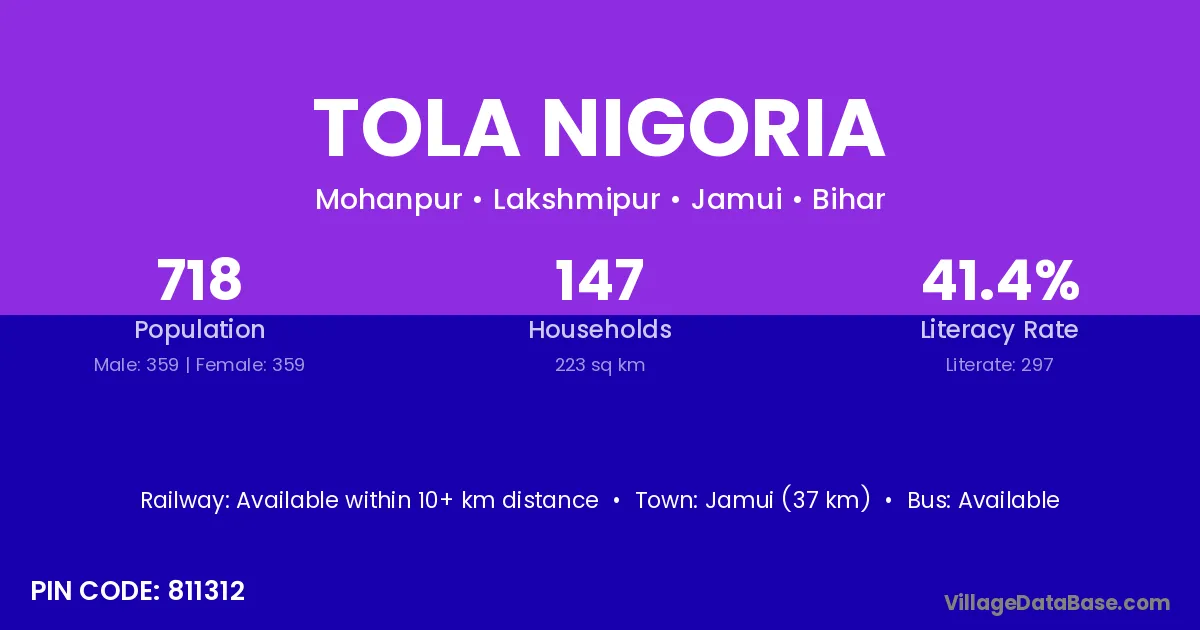 Jamui (37 km) is the nearest town to Tola Nigoria village for major economic activities and is located approximately 37 km away.
