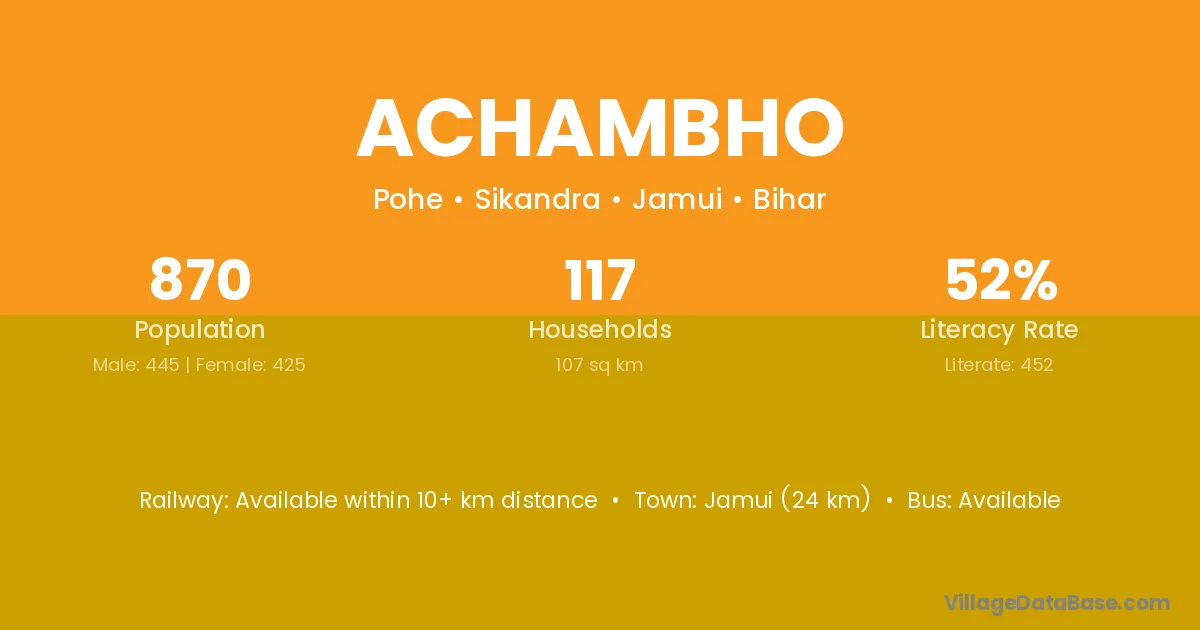 Jamui (24 km) is the nearest town to Achambho village for major economic activities and is located approximately 24 km away.