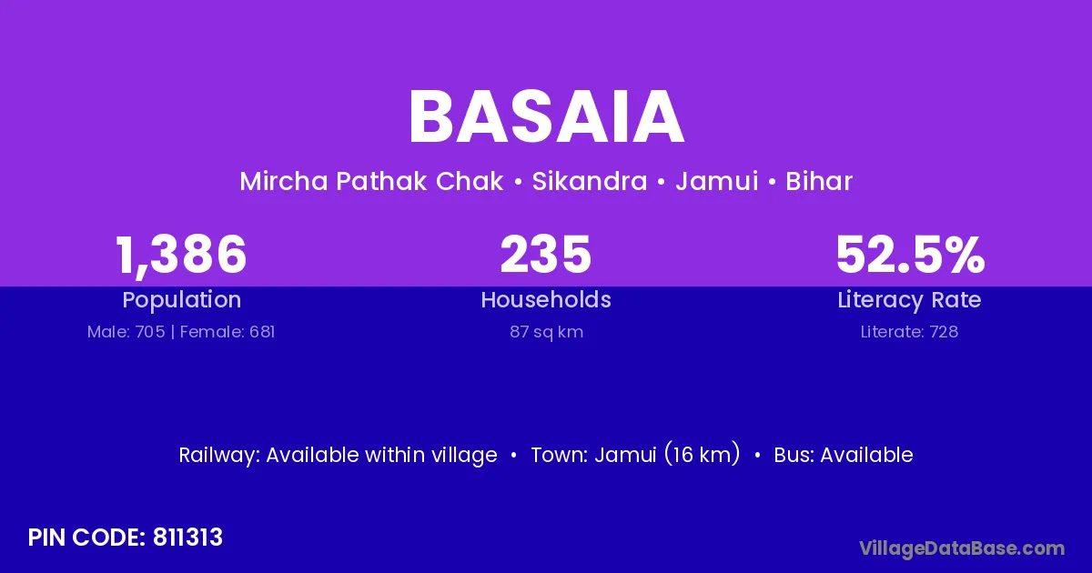 Jamui (16 km) is the nearest town to Basaia village for major economic activities and is located approximately 16 km away.