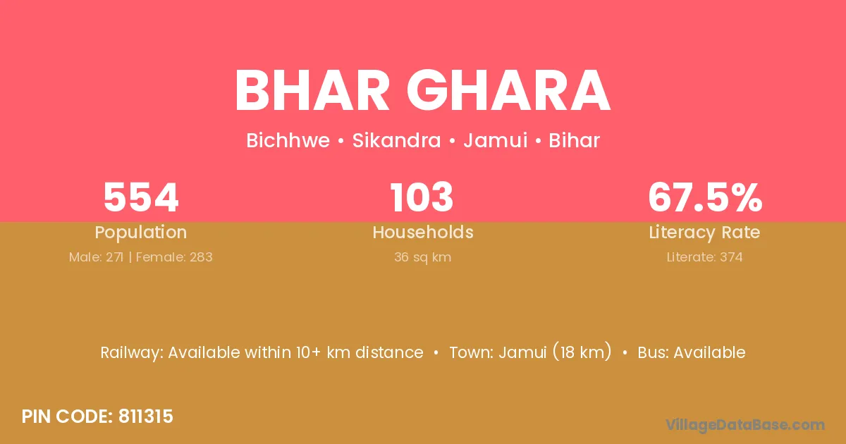 Jamui (18 km) is the nearest town to Bhar Ghara village for major economic activities and is located approximately 18 km away.