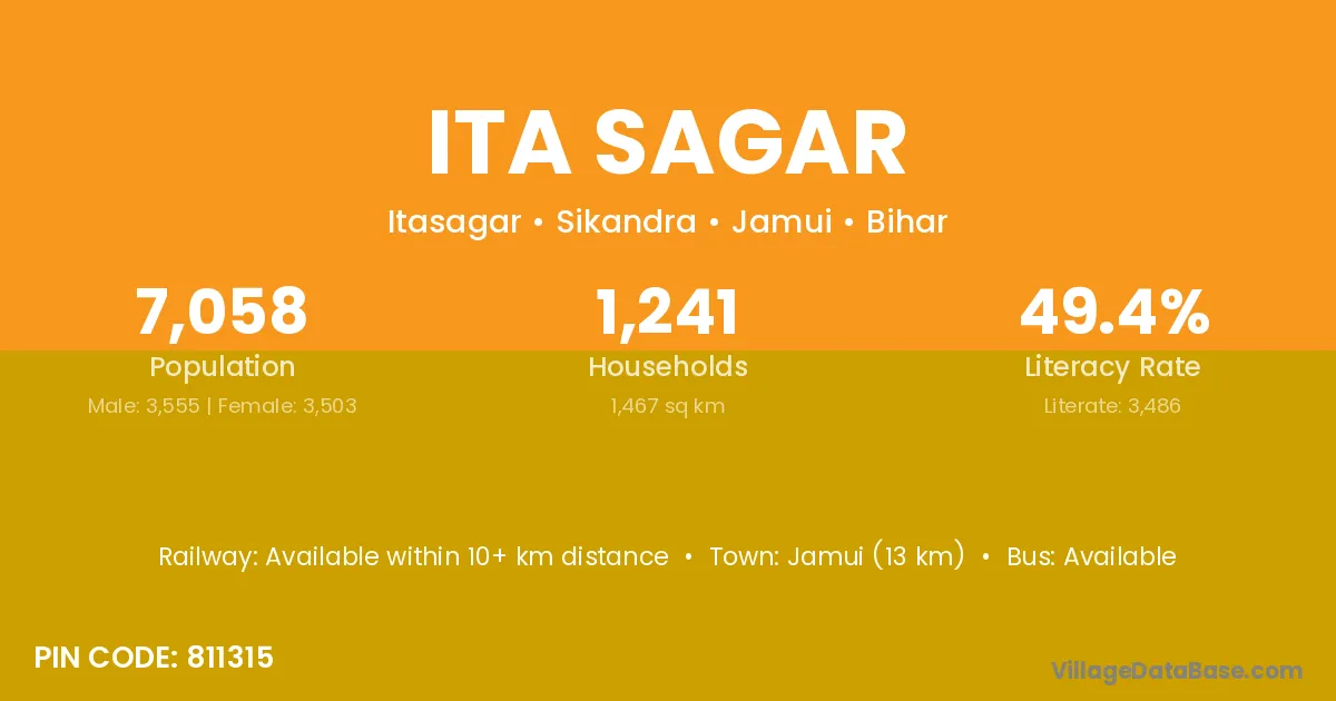 Jamui (13 km) is the nearest town to Ita Sagar village for major economic activities and is located approximately 13 km away.