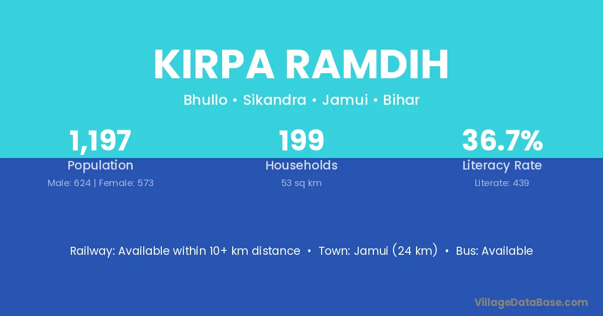 Jamui (24 km) is the nearest town to Kirpa Ramdih village for major economic activities and is located approximately 24 km away.