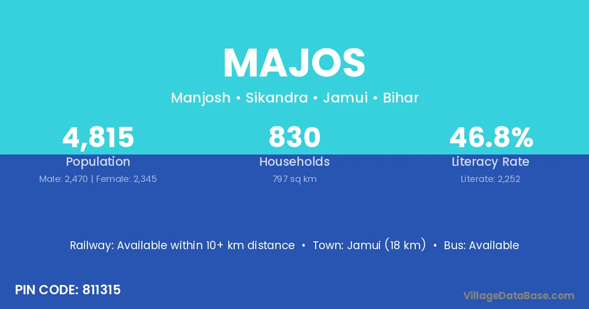 Jamui (18 km) is the nearest town to Majos village for major economic activities and is located approximately 18 km away.