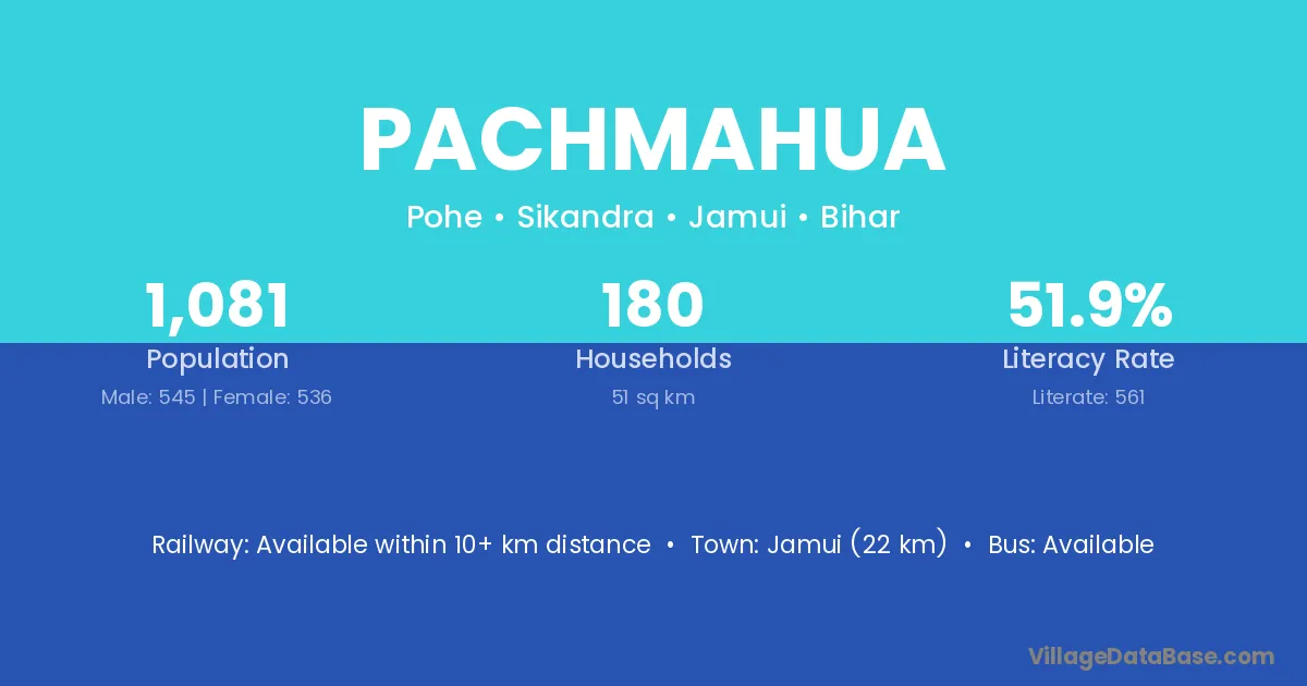 Jamui (22 km) is the nearest town to Pachmahua village for major economic activities and is located approximately 22 km away.