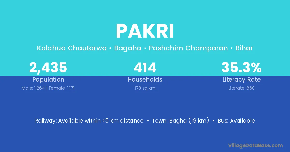 Jamui (18 km) is the nearest town to Pakri village for major economic activities and is located approximately 18 km away.