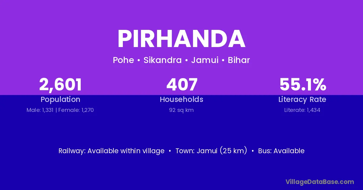 Jamui (25 km) is the nearest town to Pirhanda village for major economic activities and is located approximately 25 km away.