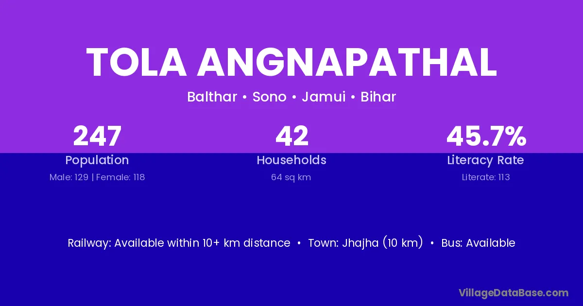 Jhajha (10 km) is the nearest town to Tola Angnapathal village for major economic activities and is located approximately 10 km away.