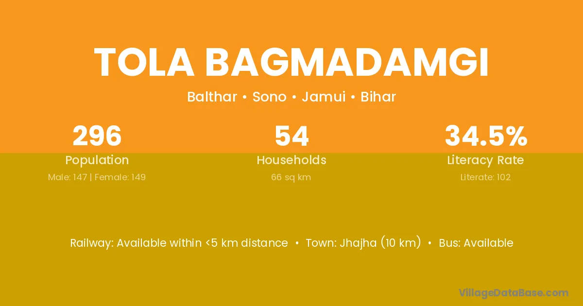 Tola Bagmadamgi village has a total population of 296 people, of which 147 are males and 149 are females.