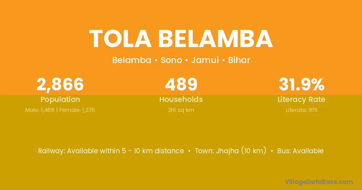 Jhajha (10 km) is the nearest town to Tola Belamba village for major economic activities and is located approximately 10 km away.