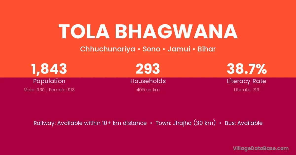 Jhajha (30 km) is the nearest town to Tola Bhagwana village for major economic activities and is located approximately 30 km away.
