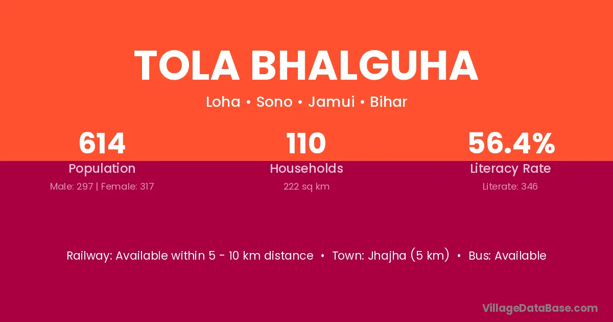 Jhajha (5 km) is the nearest town to Tola Bhalguha village for major economic activities and is located approximately 5 km away.