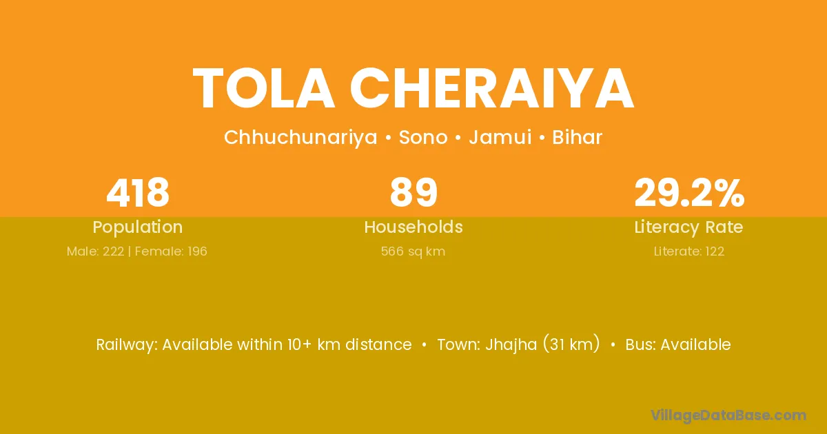 Jhajha (31 km) is the nearest town to Tola Cheraiya village for major economic activities and is located approximately 31 km away.
