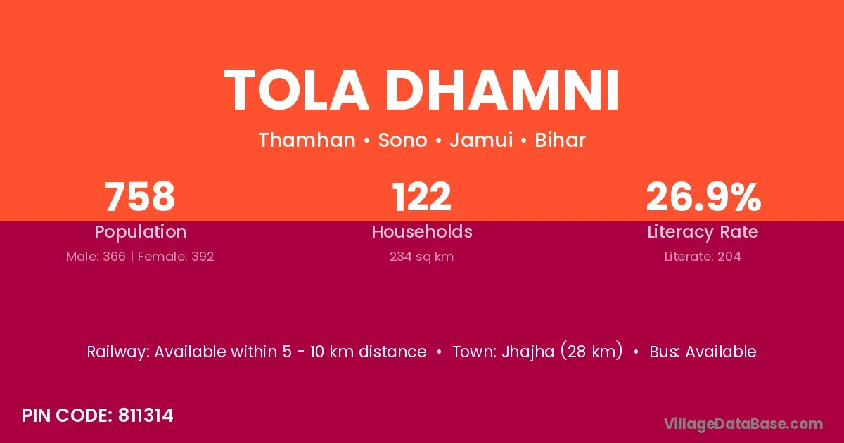 Jhajha (28 km) is the nearest town to Tola Dhamni village for major economic activities and is located approximately 28 km away.