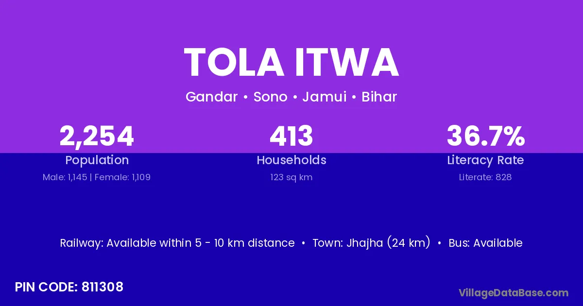 Jhajha (24 km) is the nearest town to Tola Itwa village for major economic activities and is located approximately 24 km away.