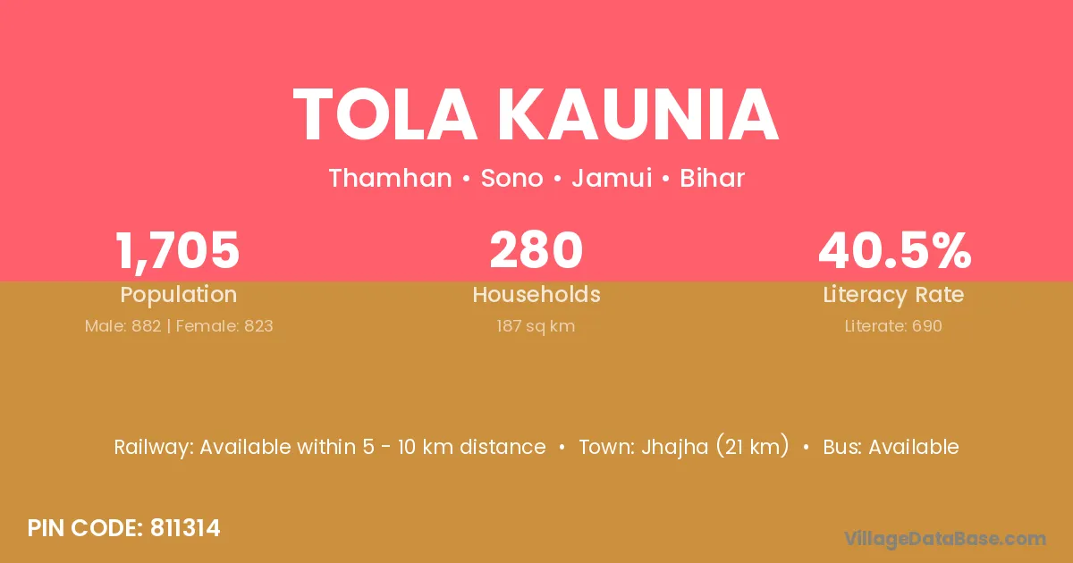 Jhajha (21 km) is the nearest town to Tola Kaunia village for major economic activities and is located approximately 21 km away.