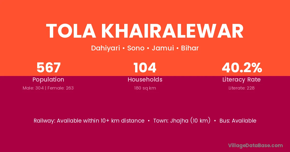 Jhajha (10 km) is the nearest town to Tola Khairalewar village for major economic activities and is located approximately 10 km away.