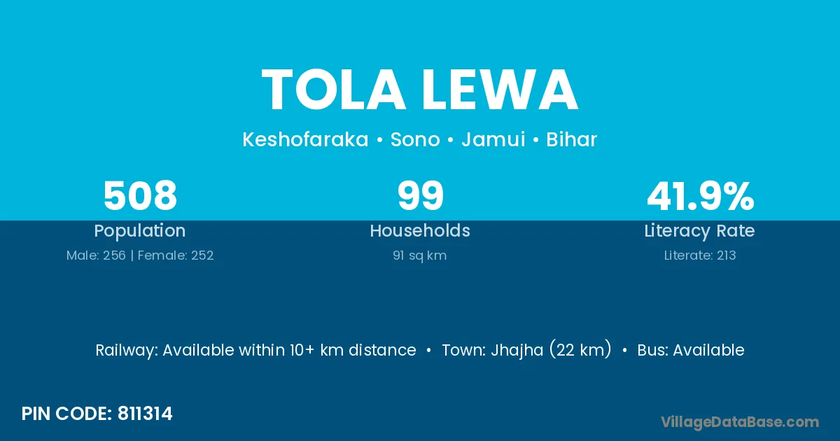 Jhajha (22 km) is the nearest town to Tola Lewa village for major economic activities and is located approximately 22 km away.