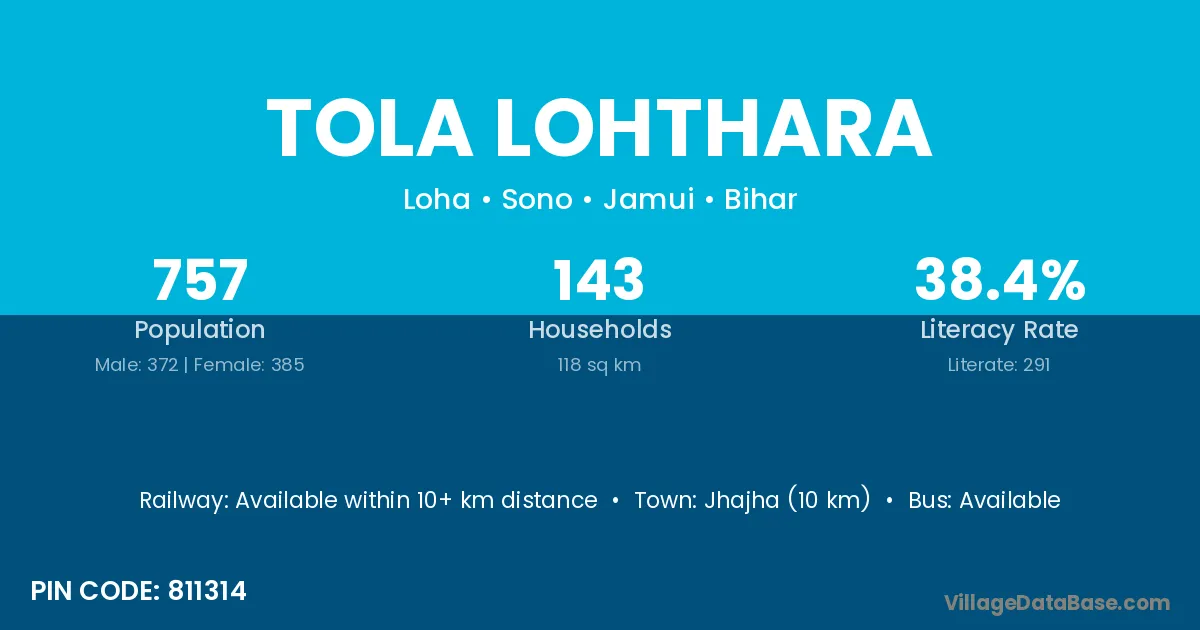 Jhajha (10 km) is the nearest town to Tola Lohthara village for major economic activities and is located approximately 10 km away.