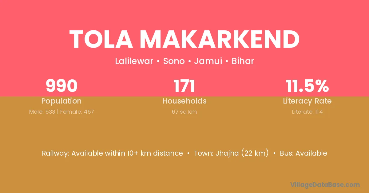 Jhajha (22 km) is the nearest town to Tola Makarkend village for major economic activities and is located approximately 22 km away.
