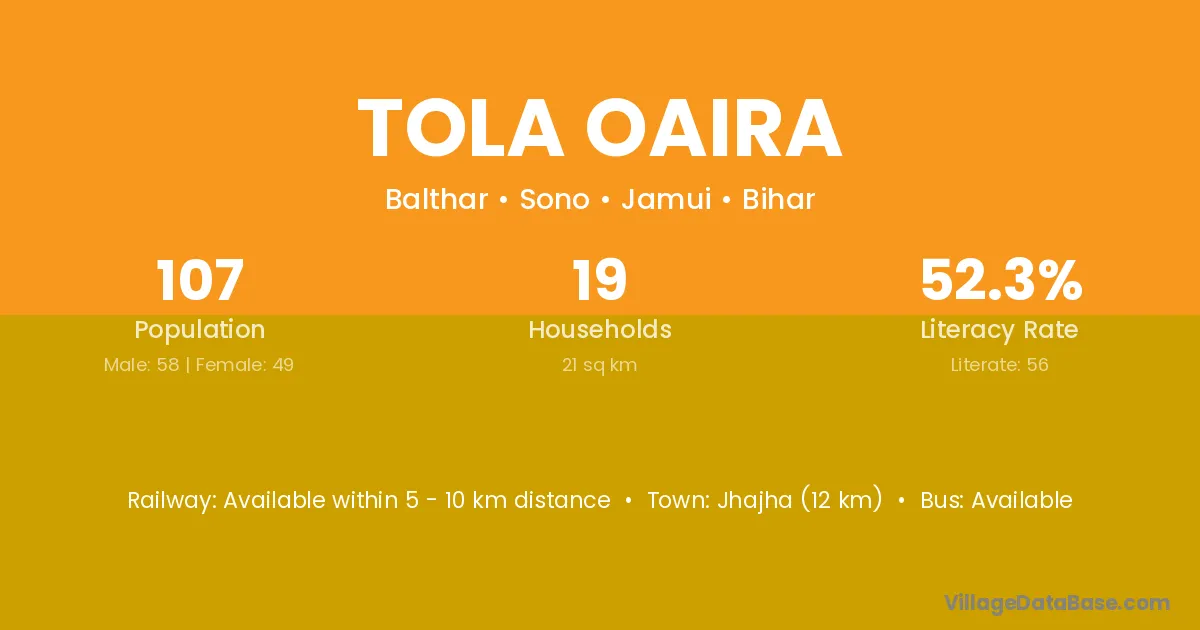 Jhajha (12 km) is the nearest town to Tola Oaira village for major economic activities and is located approximately 12 km away.