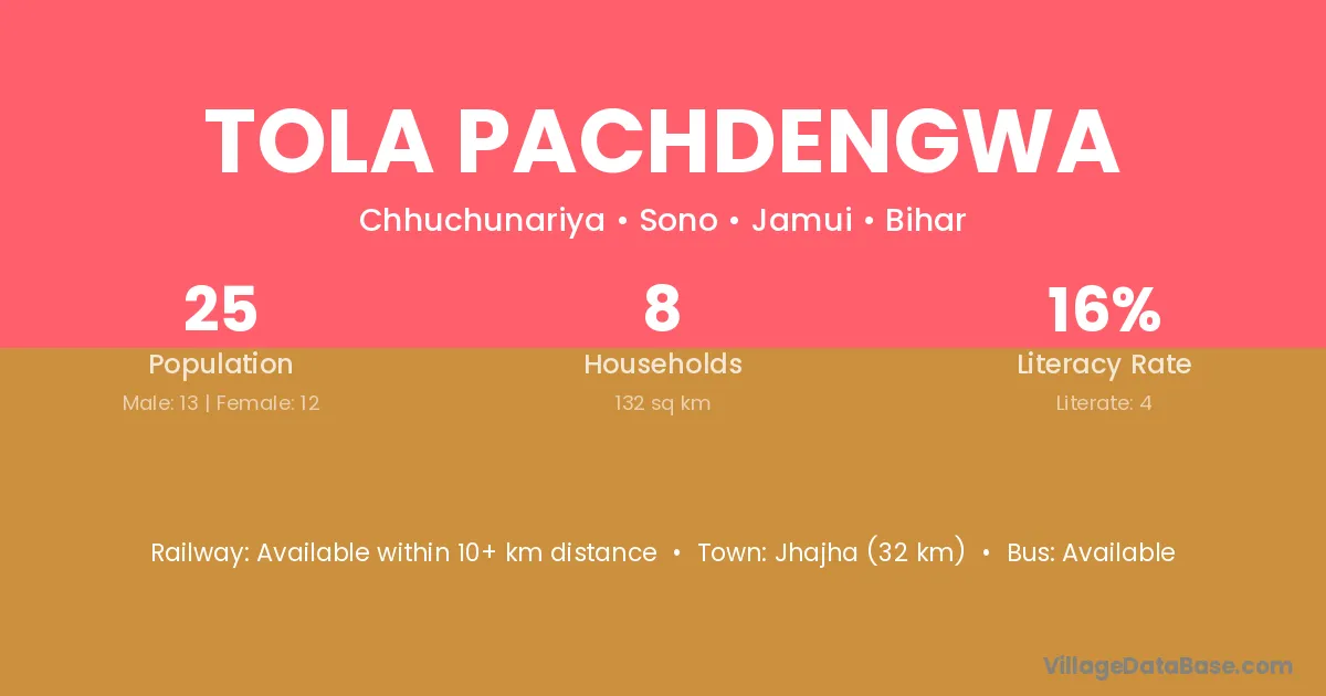 Jhajha (32 km) is the nearest town to Tola Pachdengwa village for major economic activities and is located approximately 32 km away.
