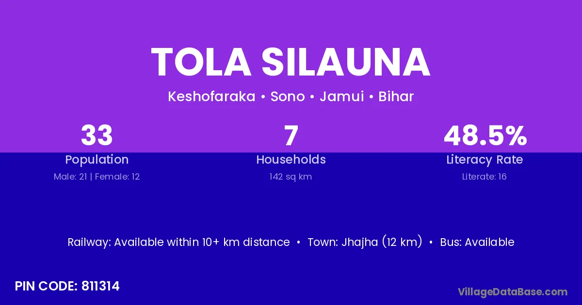 Tola Silauna village has a total population of 33 people, of which 21 are males and 12 are females.
