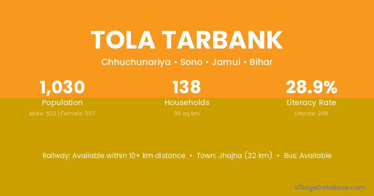 Jhajha (32 km) is the nearest town to Tola Tarbank village for major economic activities and is located approximately 32 km away.