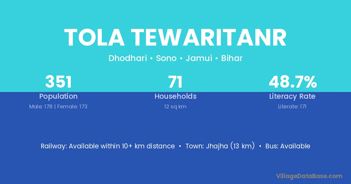 Jhajha (13 km) is the nearest town to Tola Tewaritanr village for major economic activities and is located approximately 13 km away.