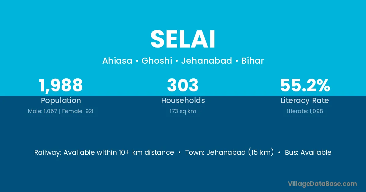 Jehanabad (15 km) is the nearest town to Selai village for major economic activities and is located approximately 15 km away.