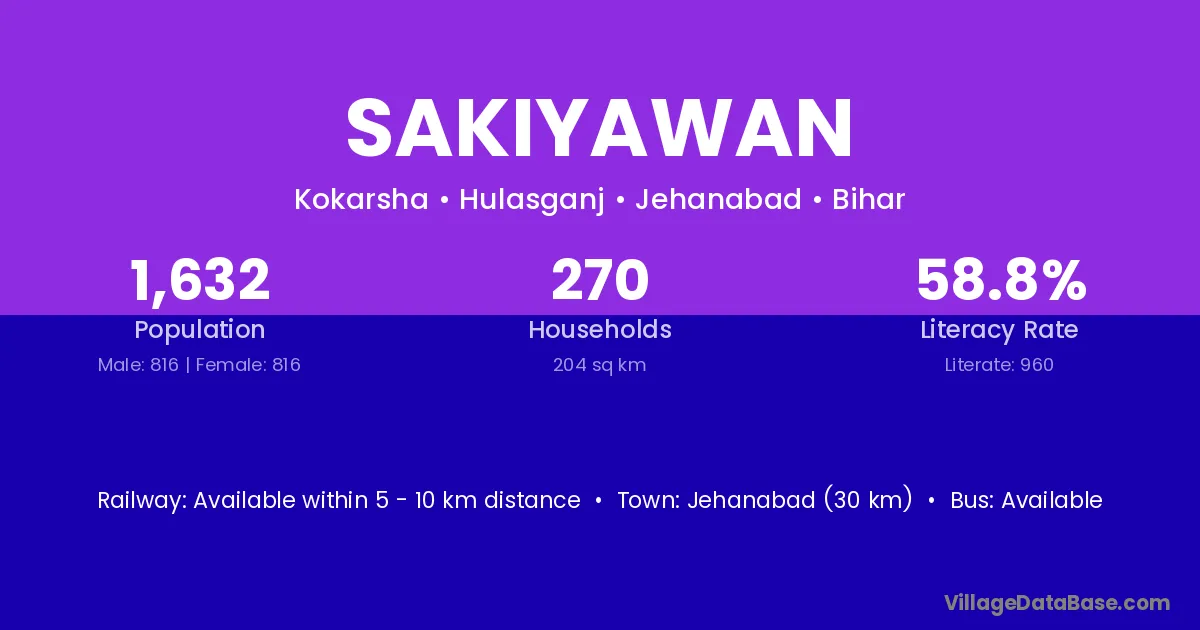 Jehanabad (30 km) is the nearest town to Sakiyawan village for major economic activities and is located approximately 30 km away.