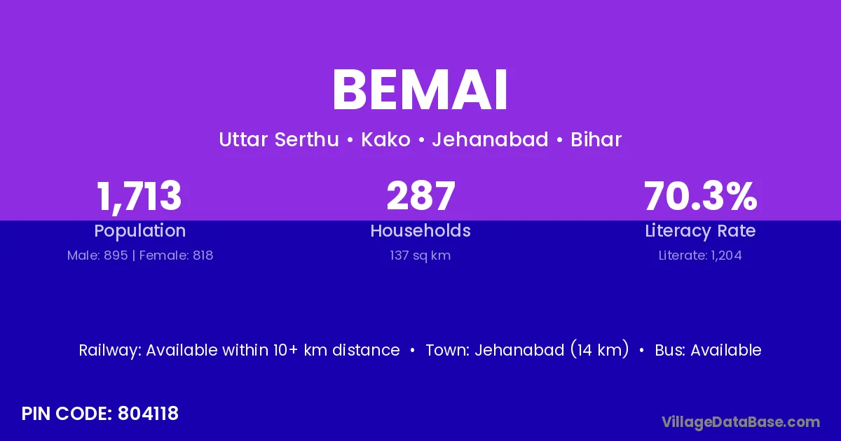 Jehanabad (14 km) is the nearest town to Bemai village for major economic activities and is located approximately 14 km away.