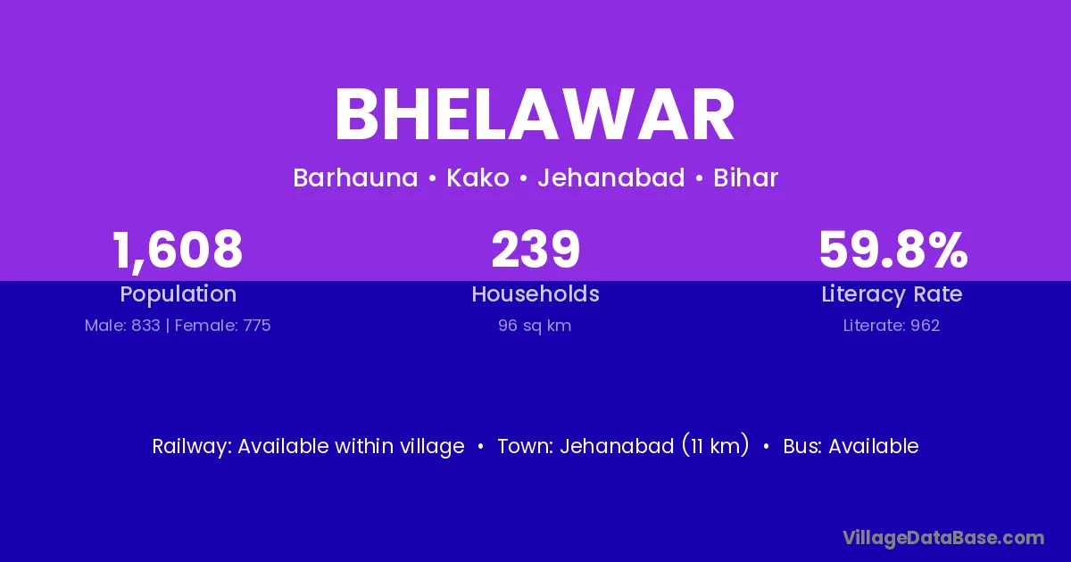 Jehanabad (11 km) is the nearest town to Bhelawar village for major economic activities and is located approximately 11 km away.