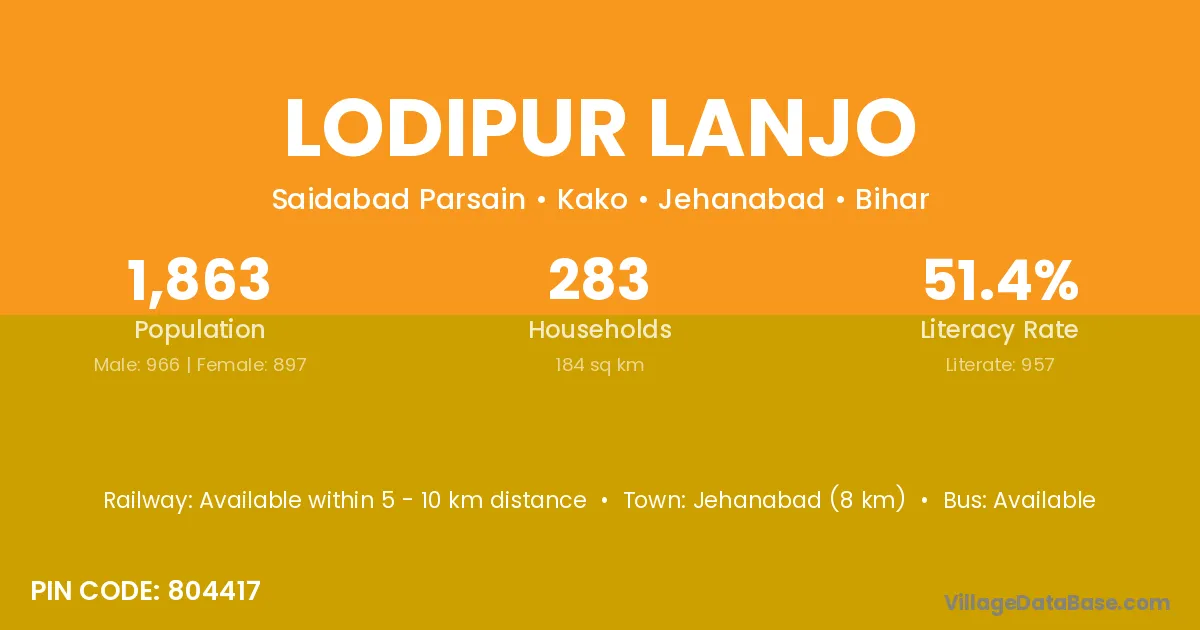 Jehanabad (8 km) is the nearest town to Lodipur Lanjo village for major economic activities and is located approximately 8 km away.