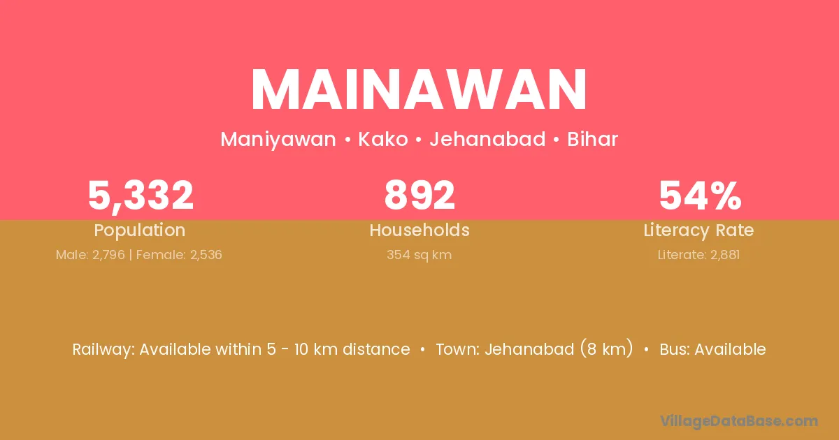Jehanabad (8 km) is the nearest town to Mainawan village for major economic activities and is located approximately 8 km away.
