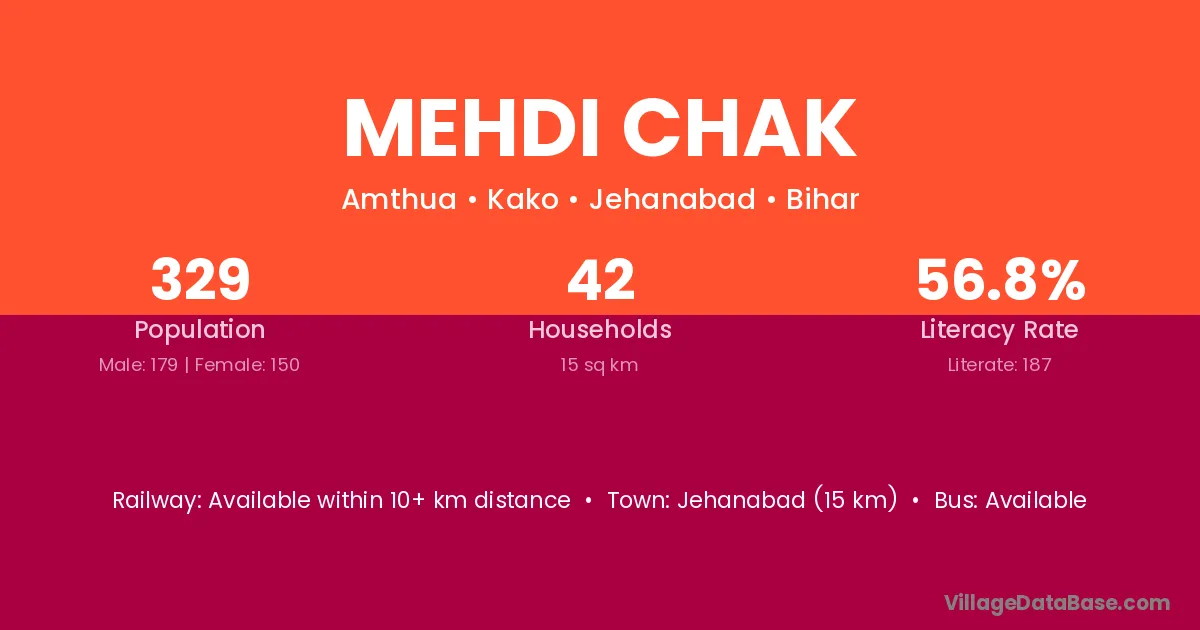 Jehanabad (15 km) is the nearest town to Mehdi Chak village for major economic activities and is located approximately 15 km away.