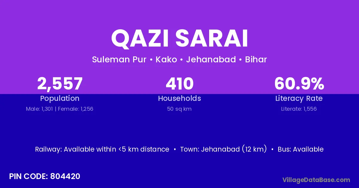 Jehanabad (12 km) is the nearest town to Qazi Sarai village for major economic activities and is located approximately 12 km away.