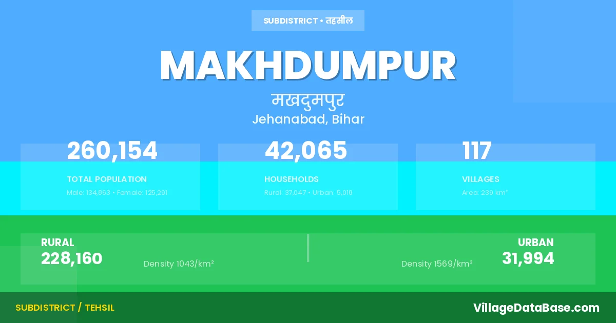 According to the 2011 census The total area of Makhdumpur Subdivision is 239 km², with a population of 260154 people. The population density is 1,088 inhabitants per square kilometre, and there are approximately 42065 houses in the sub district.