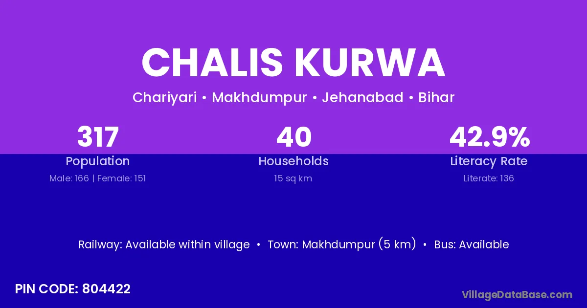 Chalis Kurwa village has a total population of 317 people, of which 166 are males and 151 are females.