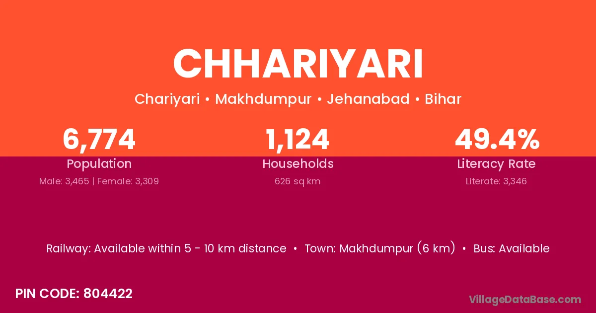 Makhdumpur (6 km) is the nearest town to Chhariyari village for major economic activities and is located approximately 6 km away.